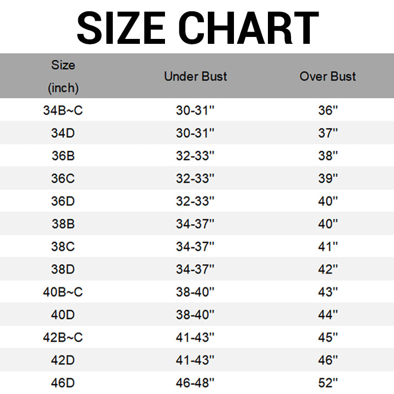 Size: 34B, 34C, 34D, 36B, 36C, 36D, 38B, 38C, 38D, 40B, 40C, 40D, 42B, 42C, 42D, 46D